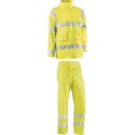 EN 471. 150D poliéster oxford/PU. Conjunto impermeable de chaqueta y pantalón con certificado de alta visibilidad. Dispone de costuras selladas. Pantalón con dos bolsillos, elástico en cintura y dos botones de regulación en el bajo. Chaqueta con capucha, dos bolsillos frontales y solapa cubre-cremallera.
