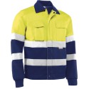 EN ISO 20471. 40% poliéster y 60% algodón de 240 g/m2 con bandas reflectantes. Detalles en azul marino de 65% poliéster y 35% algodón. Dos bolsillos superiores, dos laterales abiertos y dos interiores cierre velcro, cierre cremallera, puños elásticos, ajuste en cintura con botones a presión.