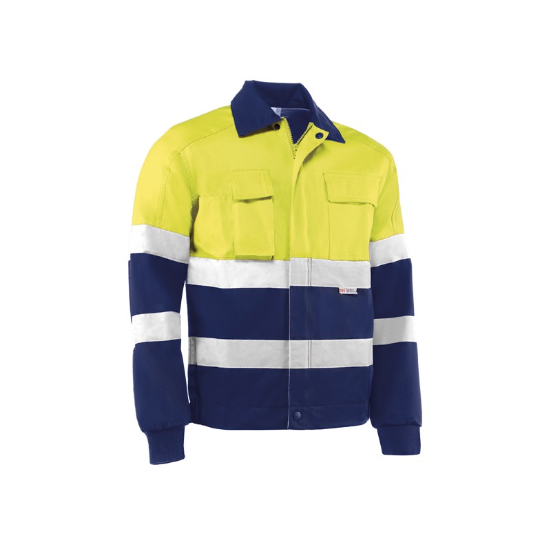 EN ISO 20471. 40% poliéster y 60% algodón de 240 g/m2 con bandas reflectantes. Detalles en azul marino de 65% poliéster y 35% algodón. Dos bolsillos superiores, dos laterales abiertos y dos interiores cierre velcro, cierre cremallera, puños elásticos, ajuste en cintura con botones a presión.