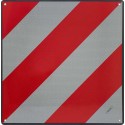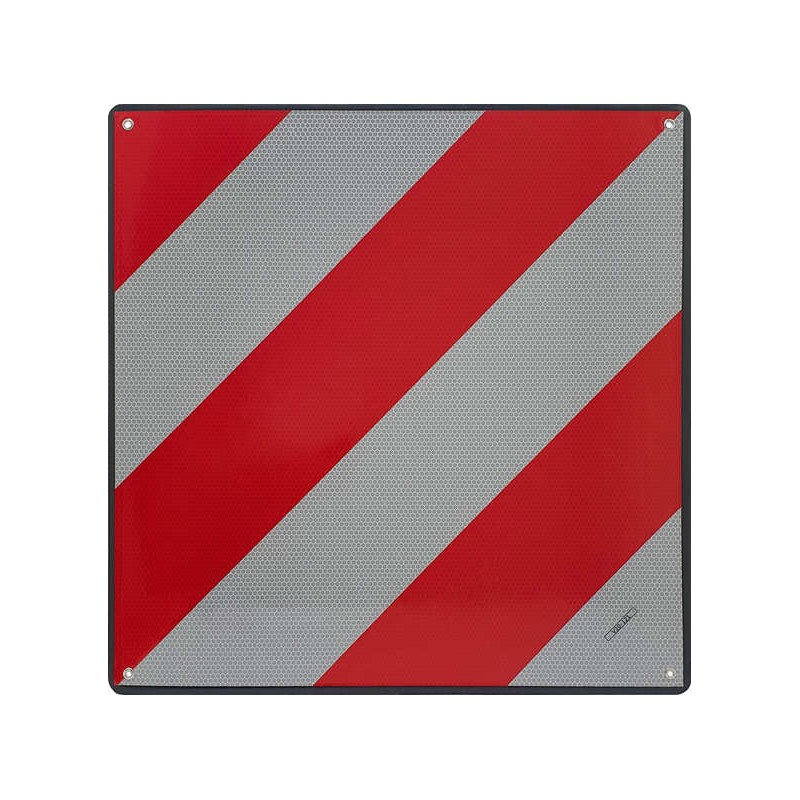 Panel de señalización retroreflectante fin de carga o carga que sobresale del vehículo, fabricada en aluminio lacado en negro mate, con vinilo Reflex N2 de 50X50 cm. La placa V20 tiene un formato cuadrado con líneas rojas y blancas dispuestas en diagonal (45º). Dispone de 4 ojales en la placa para una mejor instalación.